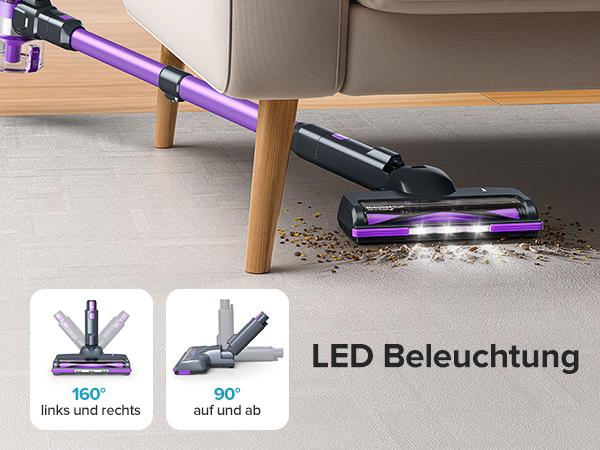 Die breite V-förmige Rolle verhindert das Verheddern der Haare. Eingebaute LED-Scheinwerfer beleuchten versteckten Staub unter Sofas, Betten und Ecken - damit nichts übersehen wird.
