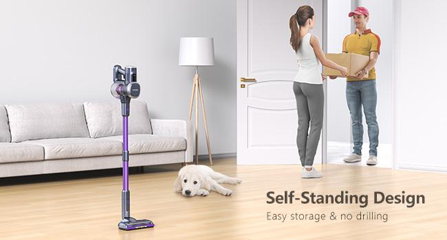 Keine Wandhalterung erforderlich! Der Staubsauger steht für sich allein - perfekt für kurze Pausen oder Unterbrechungen. Der Teleskopgriff passt sich Ihrer Körpergröße an, macht die Reinigung bequemer und reduziert die Rückenbelastung.